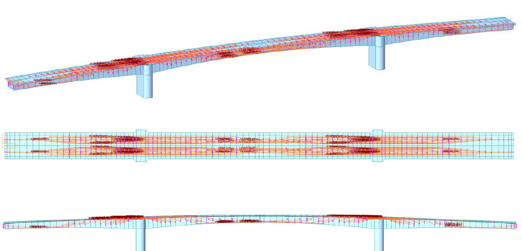 Lingkup pekerjaan kami mencakup pemodelan ulang box girder, review desain tendon box girder, serta perhitungan dan analisis deflection control untuk menjamin keakuratan struktur. Kami memberikan pendampingan teknis selama pelaksanaan konstruksi terkait pengendalian lendutan, termasuk koordinasi dengan instansi terkait, kontraktor, perencana, dan pemilik proyek melalui diskusi berkala. Di bidang dokumentasi, kami menyusun laporan perhitungan review desain tendon box girder dan laporan desain deflection control, disertai analisis pre-camber dan geometry control untuk kebutuhan konstruksi. Tim kami juga memberikan rekomendasi strategis untuk alat bantu pemasangan box girder (tanpa mencakup analisis kinerja atau kekuatan alat), serta melakukan review desain modifikasi traveler form guna mengoptimalkan proses pembangunan.